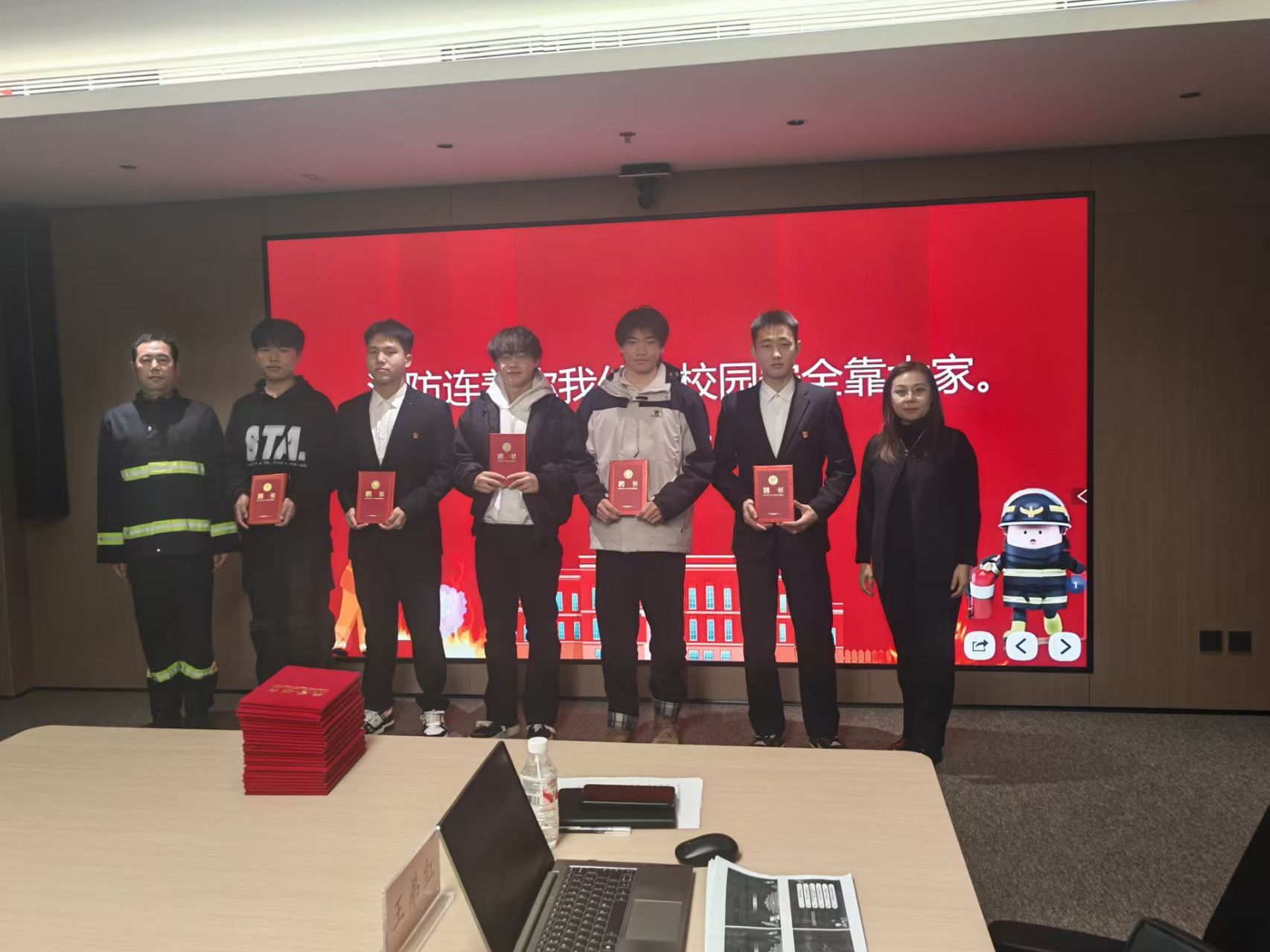 培训落幕之际,图书馆同步举行表彰聘任仪式,为在日常安全管理工作中表现突出的学生馆员颁发聘书与荣誉证书。仪式上,图书馆馆长康春丽与保卫处王弟红老师共同为张兴禄、刘佳林、吴佳泽、赵天祥、李泉鑫五位同学颁发“图书馆学生安全督导员”聘书;随后,图书馆副馆长丛笑、郑丽娟、孙明珠及保卫处王弟红老师联合为祝铭、张兴禄、吴佳泽等十三位同学授予“图书馆安全卫士”荣誉称号,表彰其在安全工作中的突出贡献。