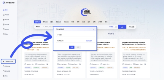 需先通过 IP 认证或机构账号认证进入系统,点击页面左下角的“漫游登录/注册”按钮,通过手机号进行个人身份认证。